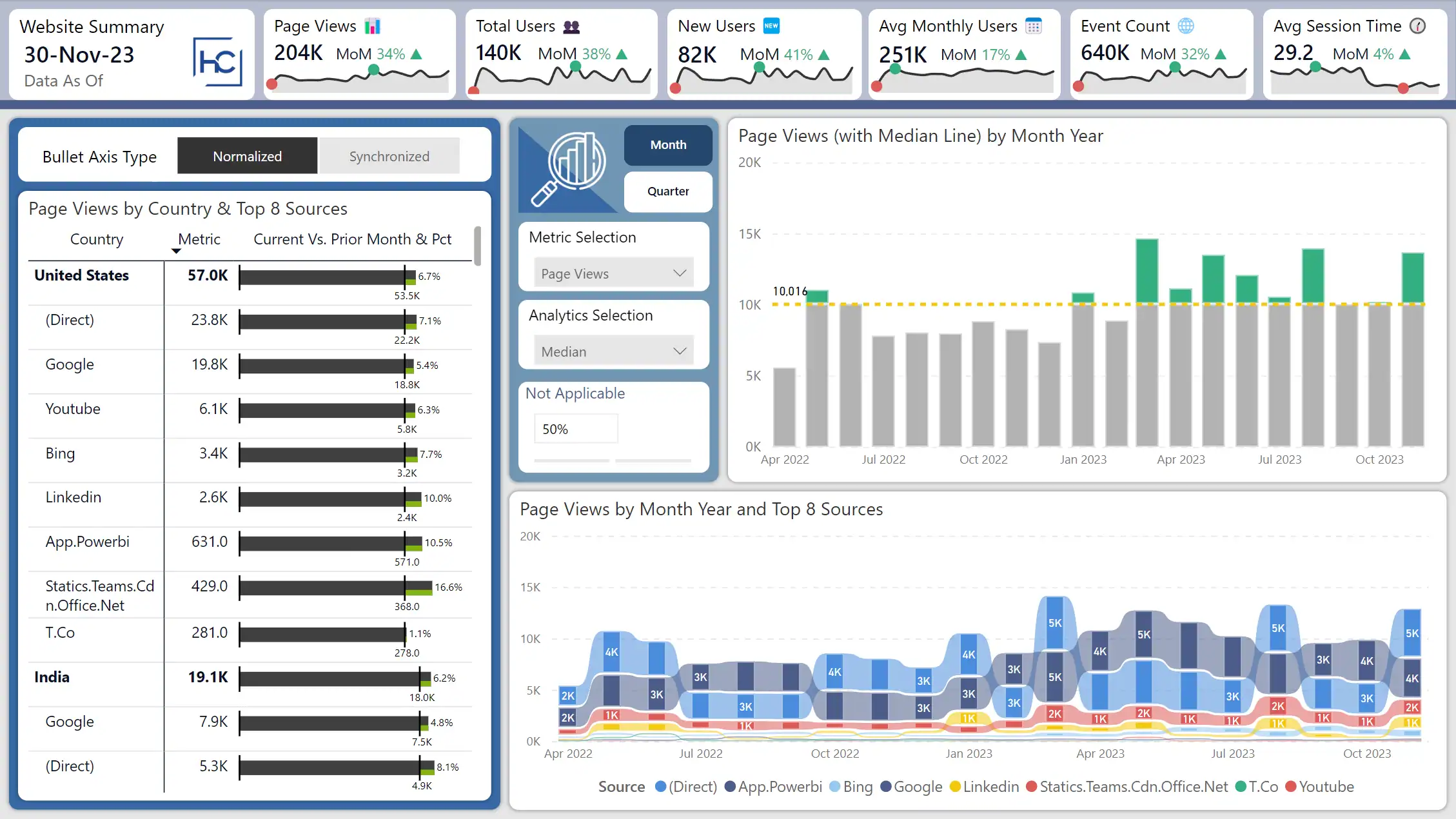 Provides a detailed report built off Google Analytics data. Allowing for a deep dive analysis on page views, user statistics, event counts, sessions and engagement, top pages visited, traffic source trends over time, and more.