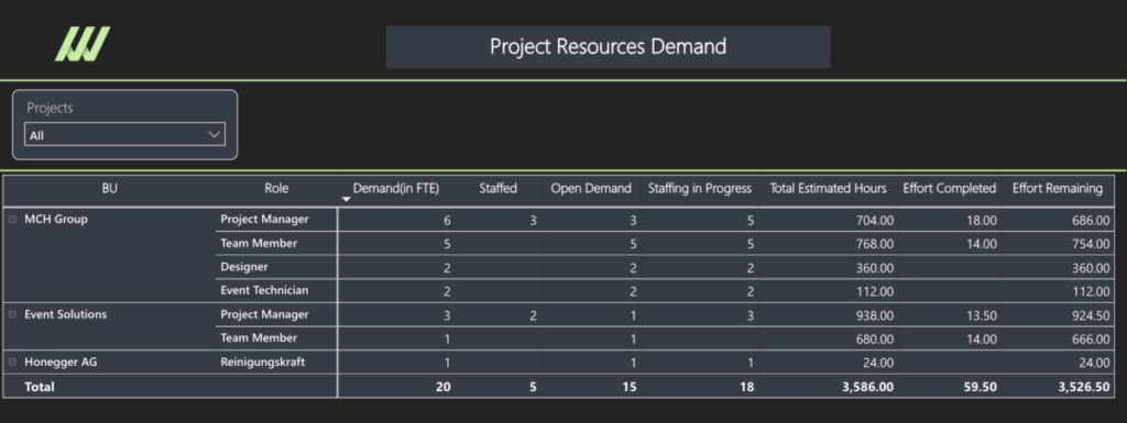Get a clear picture of who you need, where demand is building, and what delivery effort is still ahead. The Project Resources Dashboard helps organizations monitor staffing demand across projects, business units, and roles by bringing key resource metrics into one connected view.